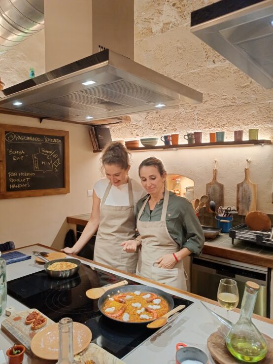 Menu: Marinated olives & local cheese (welcome snack); Local “sobrasada suquet” (starter);  Spanish Omellet (starter); Traditional paella: seafood, meat, or vegetarian (main course); Catalan cream (dessert).